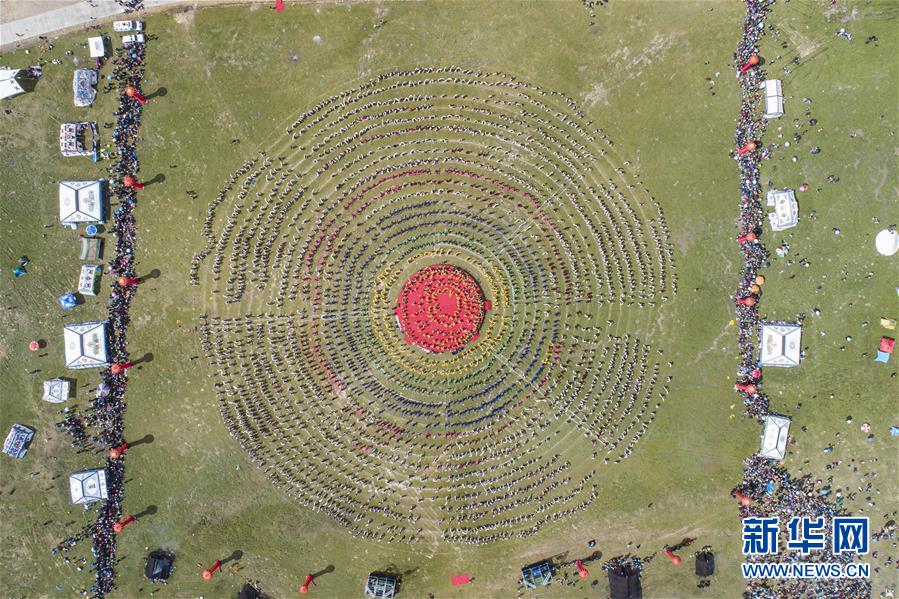 西藏首屆弦子舞展演現(xiàn)場(8月7日攝,無人機照片)。當(dāng)日,西藏首屆弦子舞展演在昌都市芒康縣舉行。眾多演員同臺獻(xiàn)藝,表演國家級非物質(zhì)文化遺產(chǎn)弦子舞,吸引西藏各地的群眾前來觀看。新華社記者孫非攝
