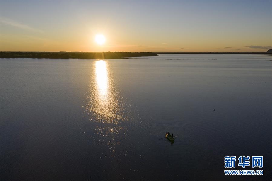 7月24日,漁民在大力加湖中捕魚(無(wú)人機(jī)照片)。大力加湖面積28.5平方公里,兩岸地勢(shì)低平,多濕地、草原,湖內(nèi)水產(chǎn)豐富。新華社記者謝劍飛攝。