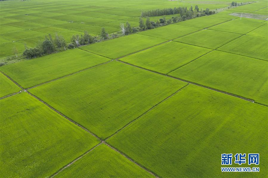 8月11日在撫遠(yuǎn)市拍攝的稻田(無人機(jī)照片)。時(shí)下,“華夏東極”黑龍江省撫遠(yuǎn)市的水稻長勢良好,蒼翠的稻田一望無際,猶如綠毯鋪在大地上。新華社記者謝劍飛攝。