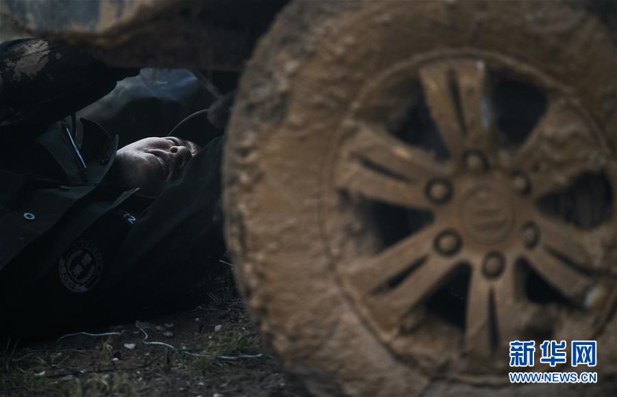 7月6日,卓乃湖保護(hù)站站長(zhǎng)秋培扎西在可可西里地區(qū)修理車輛。新華社記者薛玉斌攝
