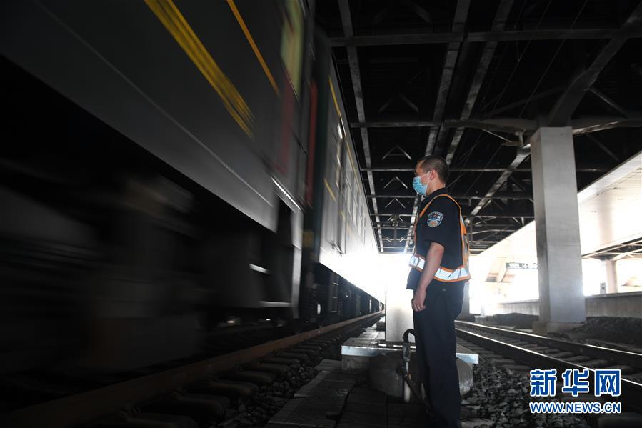 8月12日,長春火車站客運(yùn)車間上水工韓冰等候列車停站。新華社記者 林宏 攝