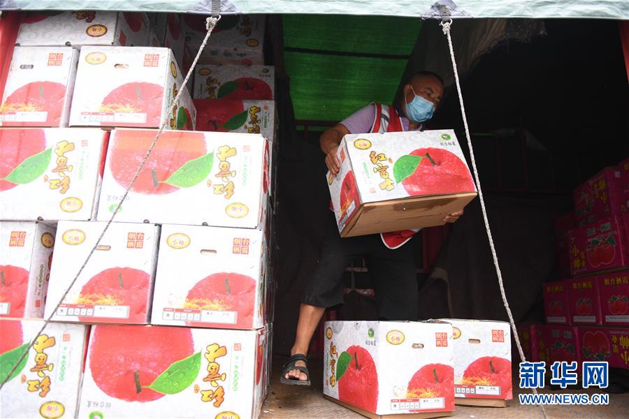 商戶在新發(fā)地批發(fā)市場周轉(zhuǎn)新區(qū)卸下蘋果(8月6日攝)。 新華社記者 張晨霖 攝