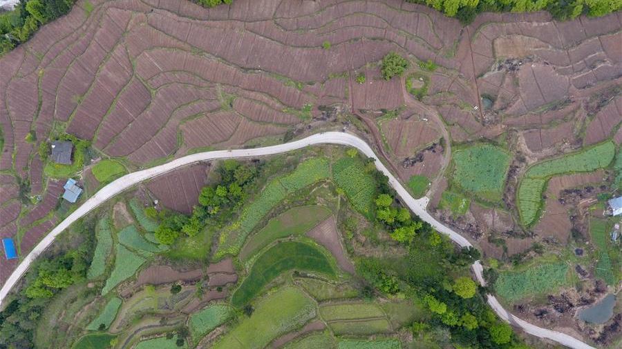 江蘇宿遷三臺山森林公園鮮花競相開放,空中俯瞰,好似鋪撒在大地上的五彩畫卷。