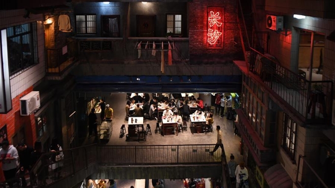 10月12日,食客們在一家將老長沙市井文化概念與餐飲結合的“網(wǎng)紅”餐館內用餐。夜色漸深,城市燈光五光十色,長沙的夜生活才剛剛開始……