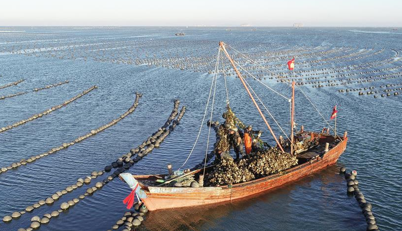 當(dāng)日,在遼寧省大連市長海縣廣鹿島海域,漁民忙碌地打撈牡蠣,呈現(xiàn)一片繁忙的豐收景象。
