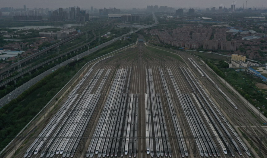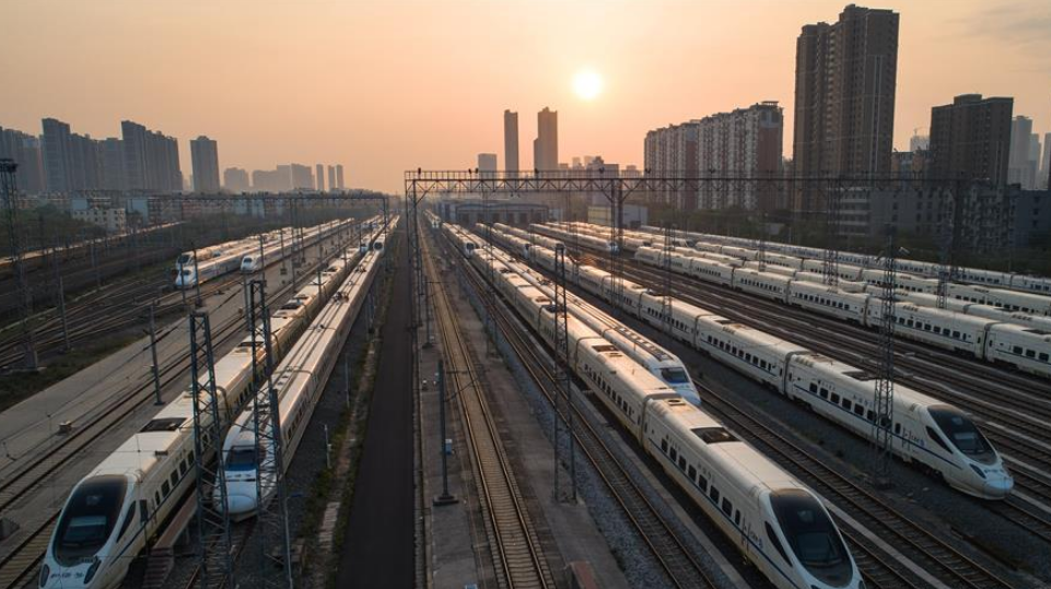 2020年4月6日,武漢動(dòng)車段高鐵動(dòng)車組整裝待發(fā)(無人機(jī)照片)。