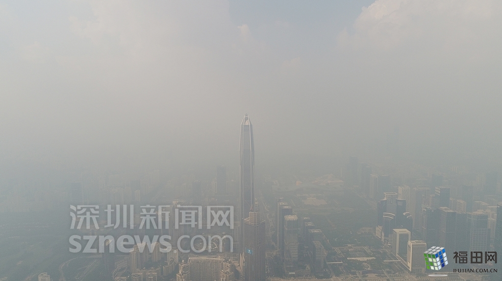8月30日下午,記者通過無人機的視角看到,福田區(qū)許多地標(biāo)性建筑物在灰霾的籠罩下顯得“猶抱琵琶半遮面”,不能以“全面目”示人。
