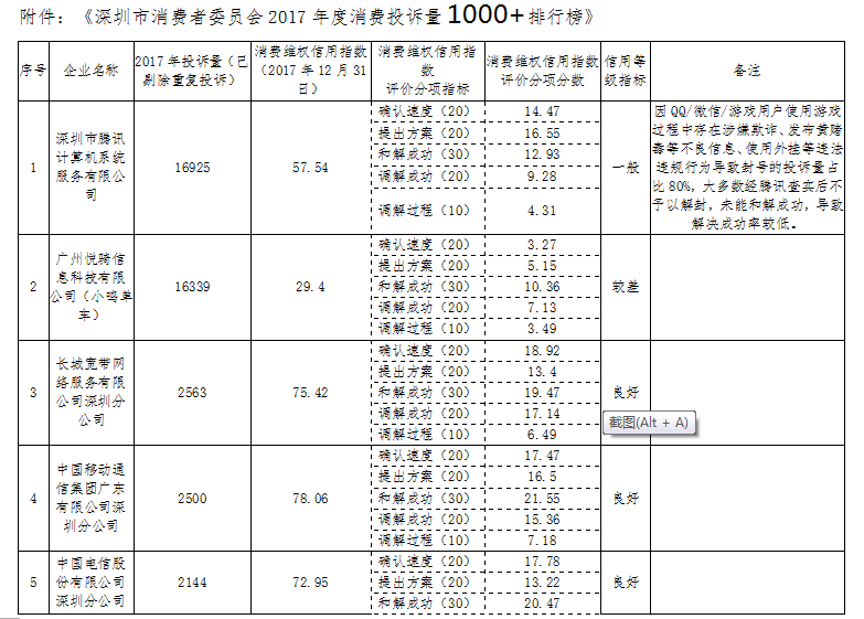 騰訊得“第一”,小鳴單車成最差——深圳市消費者委員會2017年度消費投訴量1000+排行榜發(fā)布