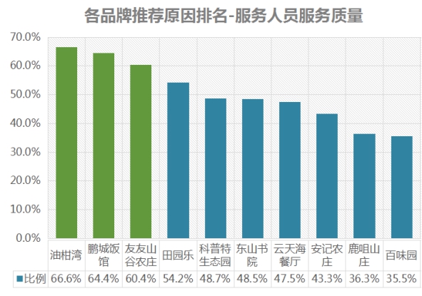 排名第一的是油柑灣,服務人員服務質量推薦率為66.6%;其次是鵬城飯館,推薦率為64.4%;第三名是友友山谷農(nóng)莊,推薦率為60.4% 。