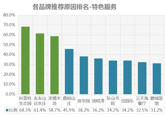 排名第一的是科普特生態(tài)園,特色服務推薦率為68.3%;其次是友友山谷農(nóng)莊,推薦率為61.4%;第三名是濃情半島,推薦率為58.7% 。