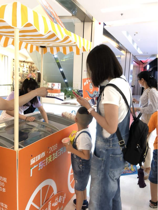 6月23日,“甜蜜初夏 慈善一直在”深圳10大地標(biāo)冰激凌義賣活動(dòng)在在福田星河COCO Park啟動(dòng)?,F(xiàn)場(chǎng),很多逛商場(chǎng)的市民掃碼購買冰淇淋,為扶貧濟(jì)困活動(dòng)捐款。特別讓志愿者感觸的是,不少家長帶著小朋友路過,看到是給貧困人們貢獻(xiàn)愛心,紛紛參與進(jìn)來要買冰激凌。