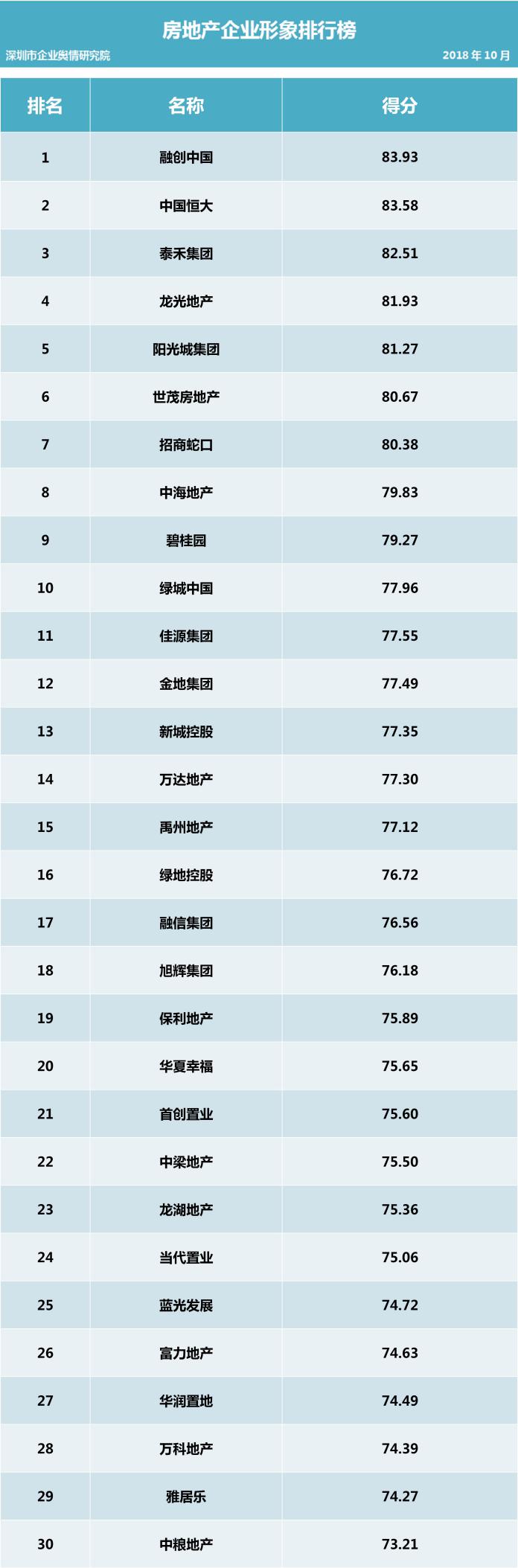 其次在房地產(chǎn)行業(yè)企業(yè)公眾形象排行榜方面,本次企業(yè)公眾形象榜單分值較上一期分值變動幅度較小,排名無變動。榜單中,融創(chuàng)中國仍舊占據(jù)企業(yè)公眾形象榜單榜首,中國恒大次之,泰禾集團再次之。而萬科也因“百萬退款”事件公眾形象大跌,繼上期榜單21位退居榜單第28位。