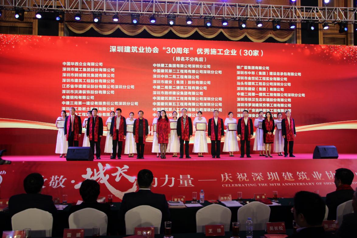 本次慶典上,深圳建筑業(yè)協(xié)會表彰了一批在促進(jìn)、推動深圳建筑行業(yè)發(fā)展中作出重大貢獻(xiàn)的優(yōu)秀企業(yè)和個人,鼓勵他們不斷探索創(chuàng)新,共同創(chuàng)造深圳建筑業(yè)的輝煌。深圳市建被授予“30周年優(yōu)秀施工企業(yè)”;翠林投資集團(tuán)董事長王忠明榮獲深圳建筑業(yè)協(xié)會“30周年優(yōu)秀企業(yè)家”稱號;深圳市建員工盧燦光、郝崇民榮獲“30周年優(yōu)秀項(xiàng)目經(jīng)理”稱號;深圳市建老員工李炳坤榮膺“30周年優(yōu)秀工匠”稱號。