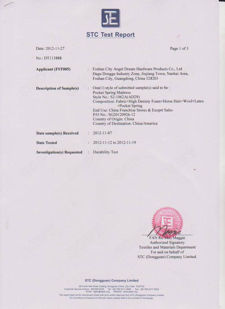 雙重熱處理起到一個全面消除了彈簧的內(nèi)應力,增加抗疲勞強度,提高了彈性極限,使彈簧的彈性、拉力和回彈力更好,床芯不易凹塌變形,彈簧不易折斷。經(jīng)權威檢測機構STC測試證明:嚴格按照美標ASTM1566耐疲勞測試,西婭圖品牌床墊達到10萬次連續(xù)錘壓不變形。(吳艷 通訊員/阿東)