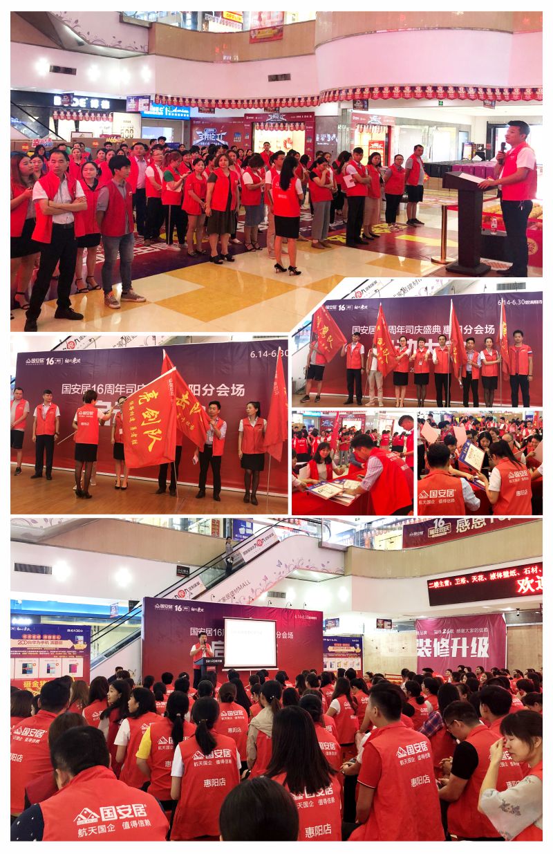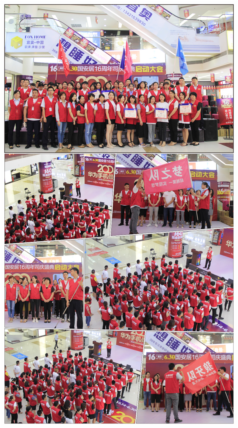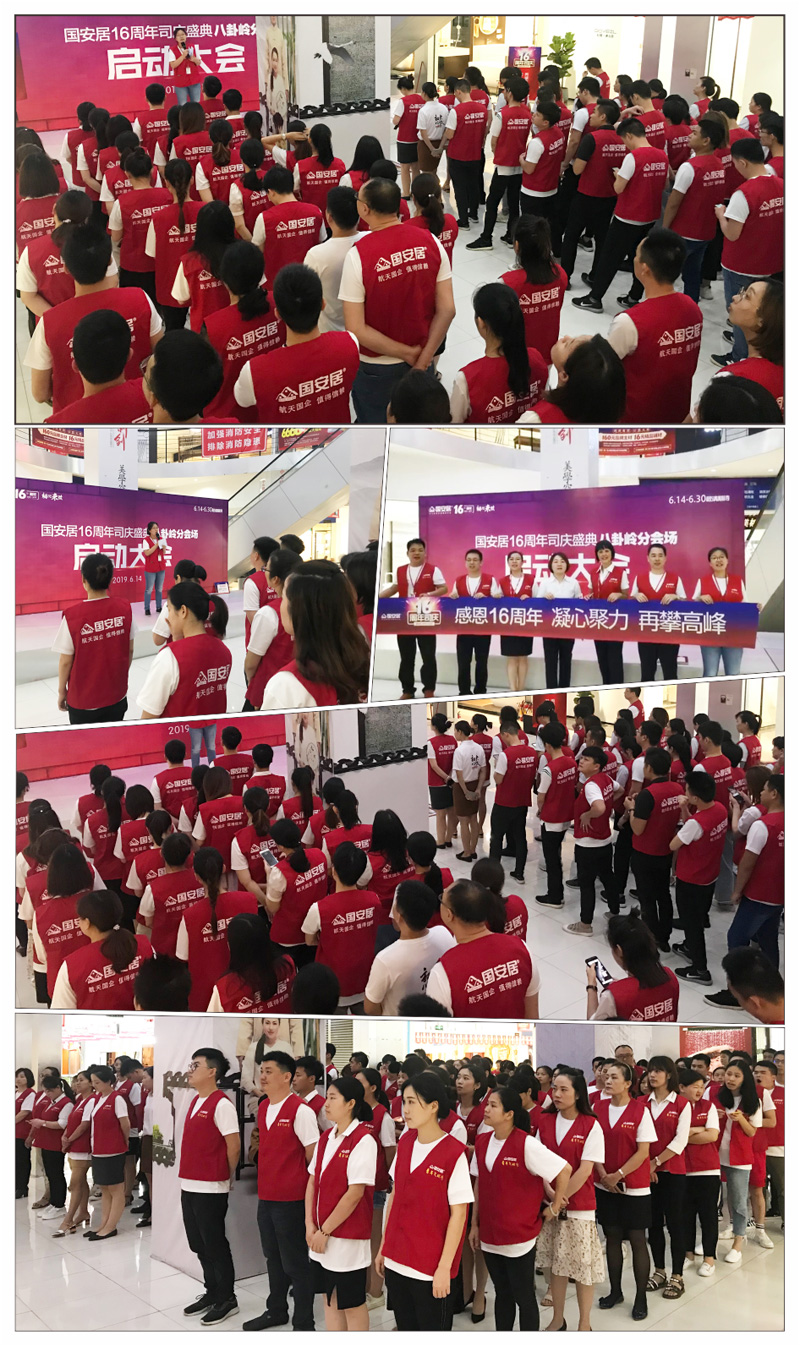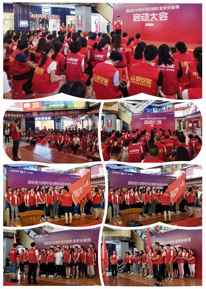 6月13日-14日,國(guó)安居“16周年司慶”啟動(dòng)大會(huì)在國(guó)安居深惠門(mén)店火熱舉行,800家品牌商家的銷(xiāo)售精英、員工代表、熱心市民等近萬(wàn)余人共同見(jiàn)證了這一意義非凡的時(shí)刻。參與者身著統(tǒng)一服裝,早早就聚集在商場(chǎng)中庭,所有人都把笑容掛在臉上,展現(xiàn)出自己最陽(yáng)光、最開(kāi)心、最具活力的一面。
