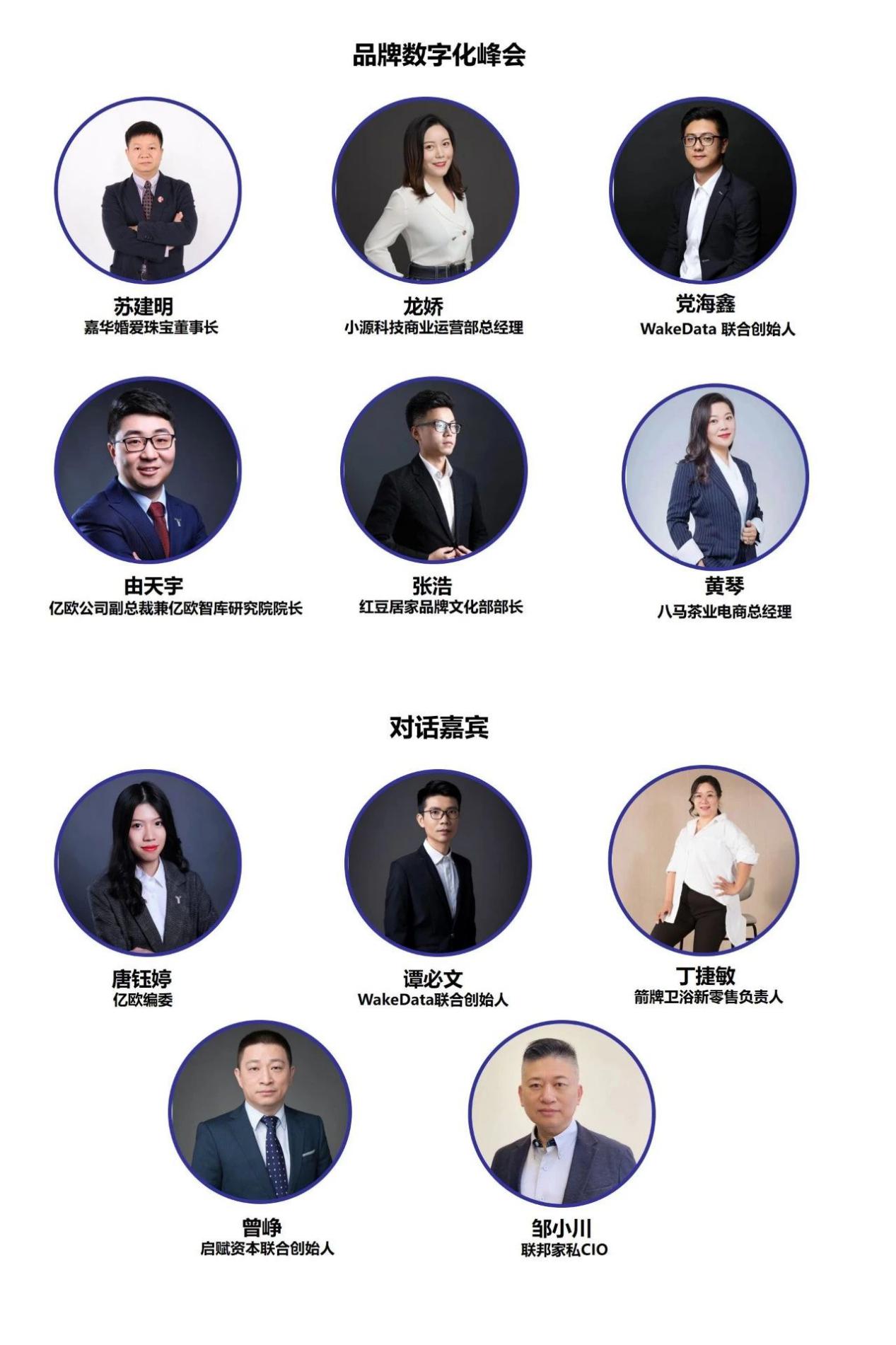 10月30日14:00—17:00(宴會廳Ⅱ)舉行品牌數(shù)字化峰會,由嘉華婚愛珠寶董事長蘇建明主持。小源科技商業(yè)運營部總經(jīng)理龍嬌演講主題《企業(yè)AI場景化服務(wù)之道》 WakeData聯(lián)合創(chuàng)始人黨海鑫演講主題《喚醒數(shù)據(jù)讓企業(yè)更懂自己的用戶》,億歐公司副總裁兼億歐智庫研究院院長由天宇演講主題《品牌的技術(shù)創(chuàng)新與潮流變革》,紅豆居家品牌文化部部長張浩演講主題《基于用戶的品牌數(shù)字化升級》,八馬茶業(yè)電商總經(jīng)理黃琴演講主題待定。圓桌對話由億歐編委唐鈺婷主持,對話嘉賓包括WakeData聯(lián)合創(chuàng)始人譚必文,啟賦資本聯(lián)合創(chuàng)始人曾 崢,箭牌衛(wèi)浴新零售負責人丁捷敏,聯(lián)邦家私CIO鄒小川。