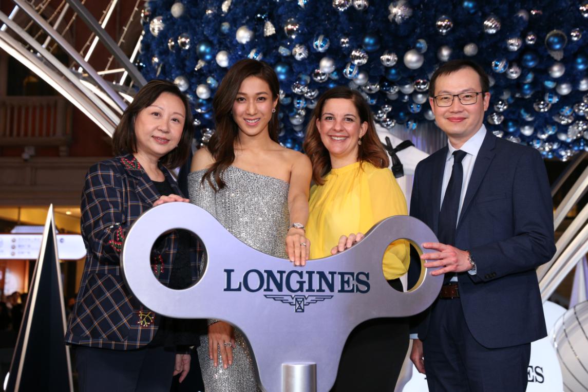 (左起)浪琴澳門副總裁鄭美齡、影視明星鐘嘉欣、金沙中國(guó)有限公司零售市場(chǎng)推廣副總裁Rita Simonetta及金沙中國(guó)有限公司商場(chǎng)管理部總監(jiān)梁俊強(qiáng)一同啟動(dòng)高達(dá)13米的藍(lán)色菱形圣誕樹(shù)底部的音樂(lè)盒裝置。