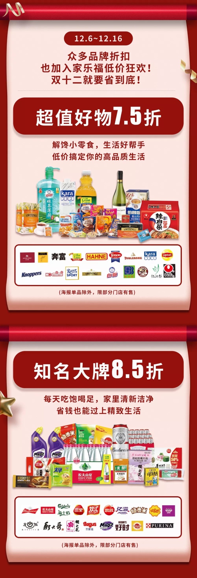 12月6日至16日,奔富、袋鼠、大湖、白貓、立頓、農(nóng)心、伯朗咖啡、憶江南等知名品牌商品,推出限時(shí)7.5折。百威、農(nóng)夫山泉、三全、雙匯、億滋、好時(shí)、偉嘉等大牌商品,奉上限時(shí)8.5折。寶潔系列產(chǎn)品,組合購(gòu)買(mǎi),滿減更加優(yōu)惠;聯(lián)合利華系列產(chǎn)品,兩件折扣、勁爆組合價(jià)、買(mǎi)一送一歡樂(lè)購(gòu)。
