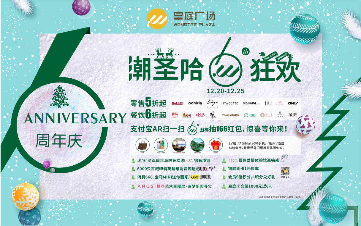 六周年慶期間,深圳皇庭廣場攜手場內(nèi)200余家優(yōu)質(zhì)商戶、銀聯(lián)等進(jìn)行資源合作,并通過自有小程序,組合線上引流包,啟動支付寶AR掃碼抽LV、華為手機、166元現(xiàn)金紅包及商戶百萬代金券驚喜;網(wǎng)紅餐飲、時尚零售折扣低至冰點;更有迷“6”周年派對狂歡送百萬好禮,寶馬MINI送回家等驚喜活動,期待與你在皇庭的光影空間里拉近距離,一起吃喝玩樂,嗨購潮玩,6周年的故事期待有你參與!
