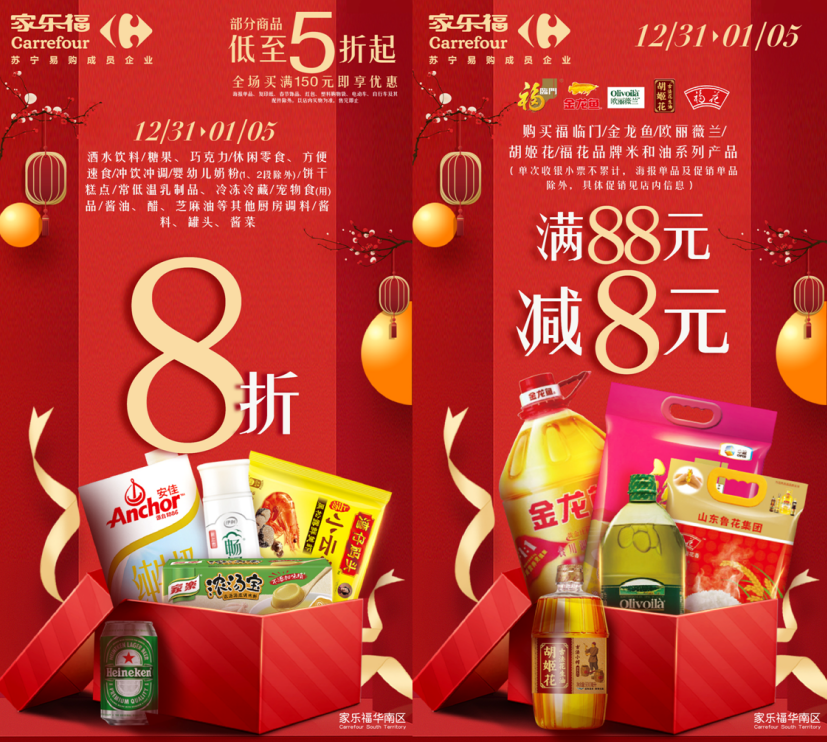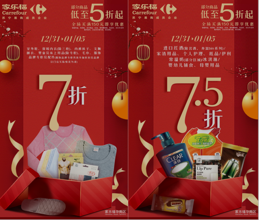 12月31日至1月5日,顧客于家樂福華南區(qū)門店全場買滿150元,即享指定產(chǎn)品5折起優(yōu)惠,省錢攻略一次解鎖。