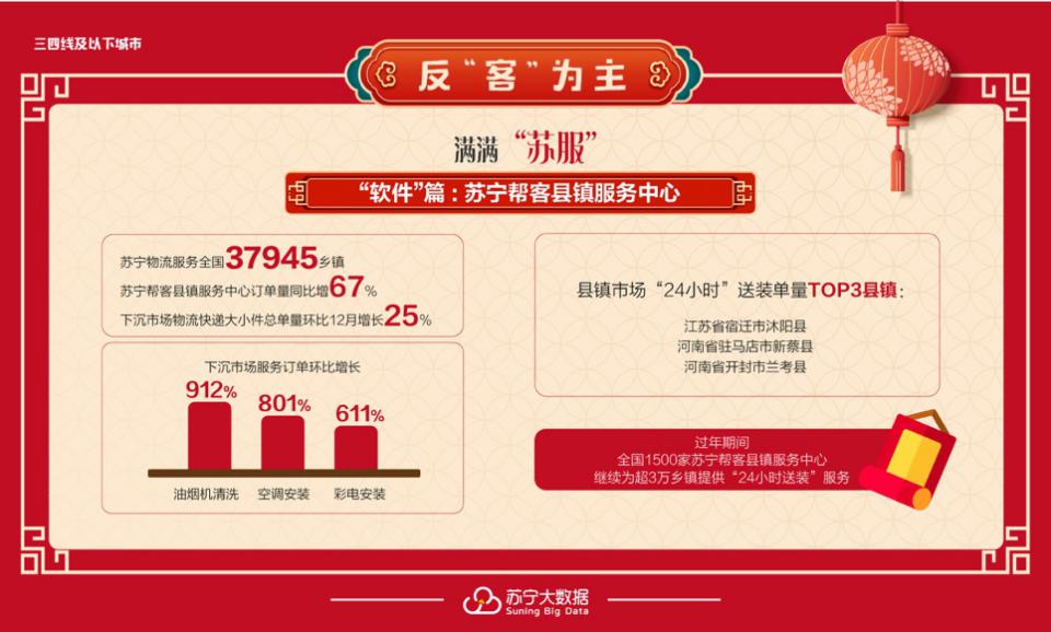 蘇寧物流數(shù)據(jù)顯示,春節(jié)下沉市場(chǎng)物流快遞大小件總單量環(huán)比12月增長(zhǎng)25%。