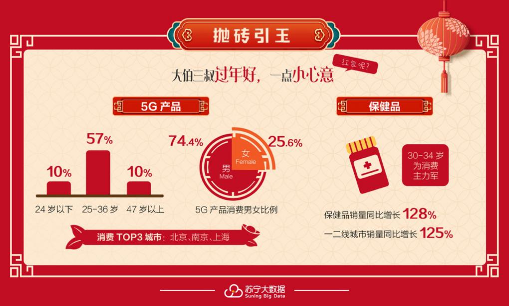 要說2019年末人們討論最多的關(guān)鍵詞有哪些,5G一定是其中一個(gè)。除了保健品,5G產(chǎn)品成了人們的春節(jié)消費(fèi)新寵,報(bào)告顯示,5G產(chǎn)品銷量最好的三個(gè)城市分別為北京、南京、上海,消費(fèi)者年齡主要集中在25-36歲之間,占比總體的57%。有趣的是,24歲以下的年輕人和47歲以上中老年人,占比均在10%左右??磥砟贻p人回家過年也不忘把“潮流單品”帶給父母一輩。