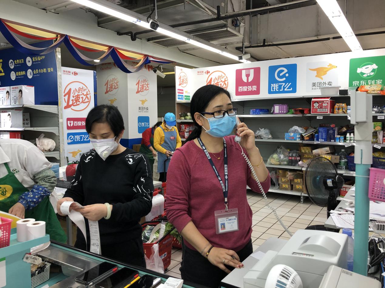 “最近十幾天,我們每天都要工作12個小時以上。”說這話的正是家樂福深圳梅林店的電商主管王立華,由她帶領(lǐng)的5人小團隊肩負(fù)起該店“配送到家”服務(wù)的揀貨、核單、打包、確認(rèn)、與騎手交貨等工作。疫情當(dāng)前為避開人群,更多的市民選擇在線上外賣平臺訂購超市的商品配送到家,因此超市的線上訂單猛增。為了實現(xiàn)“1小時速達(dá)”的承諾,避免訂單超時,王立華要求團隊從出單到打包好不能超過20分鐘,每天過手的各類商品有上千件?!凹覙犯C妨值甑馁u場面積大概是5000平方米,每天上下樓跑多少趟具體倒是沒有統(tǒng)計過,但像現(xiàn)在特殊時期,我們一天在網(wǎng)上接到的‘配送到家’服務(wù)訂單基本都要超過800單,有時候會到1000單?!蓖趿⑷A回答記者時,額頭上一直有細(xì)密的汗珠,聲音也有點沙啞了。