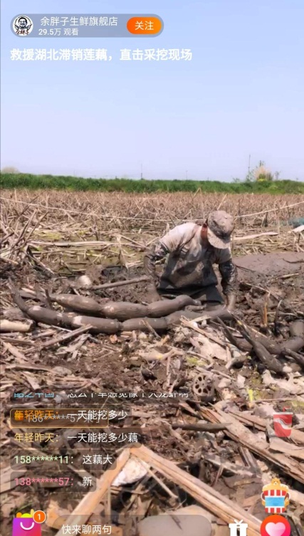 除了湖北的縣長、市長外,普通的湖北商戶不甘落后。8日上午,荊州洪湖的陽光明媚,“余胖子生鮮旗艦店”的店主便打開手機接通了直播,樸實的農(nóng)民性格讓他面對鏡頭一時不知該說什么好,簡單問好后,他就轉(zhuǎn)身下了塘,開始從厚重的泥土里拔出一根根新鮮的蓮藕。有不少00后網(wǎng)友是第一次見到挖藕的過程,他們發(fā)現(xiàn)原來潔白爽口的大藕居然是從泥中挖出來的,“挖藕真的太不容易了,一個上午要泡在塘泥里?!?/p>