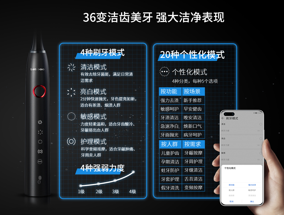 值得一提的是,力博得智能聲波牙刷·星鉆內(nèi)置壓力傳感系統(tǒng),具有36種潔齒檔位,4種潔齒模式和4級力度調(diào)節(jié)。強(qiáng)勁清潔模式:滿足日常清潔需求;拋光亮白模式:適合追求亮白人士;溫和敏感模式:適合牙齦易出血人群;輕柔護(hù)理模式:為牙病問題而生,體貼入微。以上模式各有1-4級力度調(diào)節(jié),更加人性化。