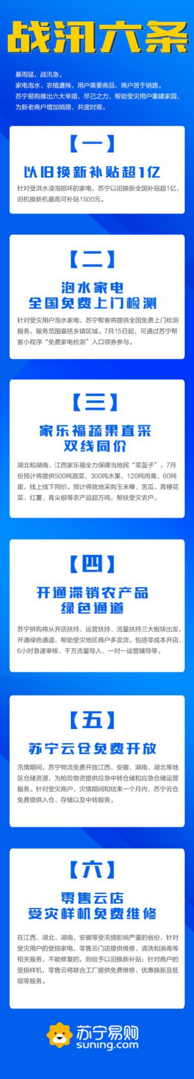 在江西、湖北、湖南、安徽等受汛情影響嚴(yán)重的省份,針對(duì)受災(zāi)用戶的受損家電,零售云門(mén)店也將提供維修、清洗和消毒,不能修復(fù)的,則給予以舊換新補(bǔ)貼。
