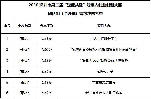 2020深圳市第二屆“殘健共融”殘疾人創(chuàng)業(yè)創(chuàng)新大賽團(tuán)隊組(助殘類)晉級決賽名單