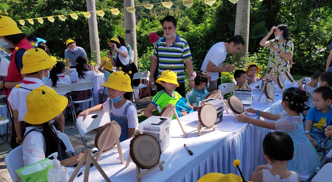 在自然課堂,分為科普展覽區(qū)、繪畫活動區(qū)和蜂產(chǎn)品體驗區(qū),孩子們戴著黃色的卡通帽子,像一只只勤勞的小蜜蜂忙碌地參與各項活動。在科普展板前,他們認(rèn)真記錄蜜蜂的基本知識、品質(zhì)精神,了解蜜蜂與人類的關(guān)系、保護(hù)生物多樣性的重要性,家長們結(jié)合展板耐心講解《深圳經(jīng)濟(jì)特區(qū)科學(xué)技術(shù)普及條例》、全國科普日、深圳科普月等知識。