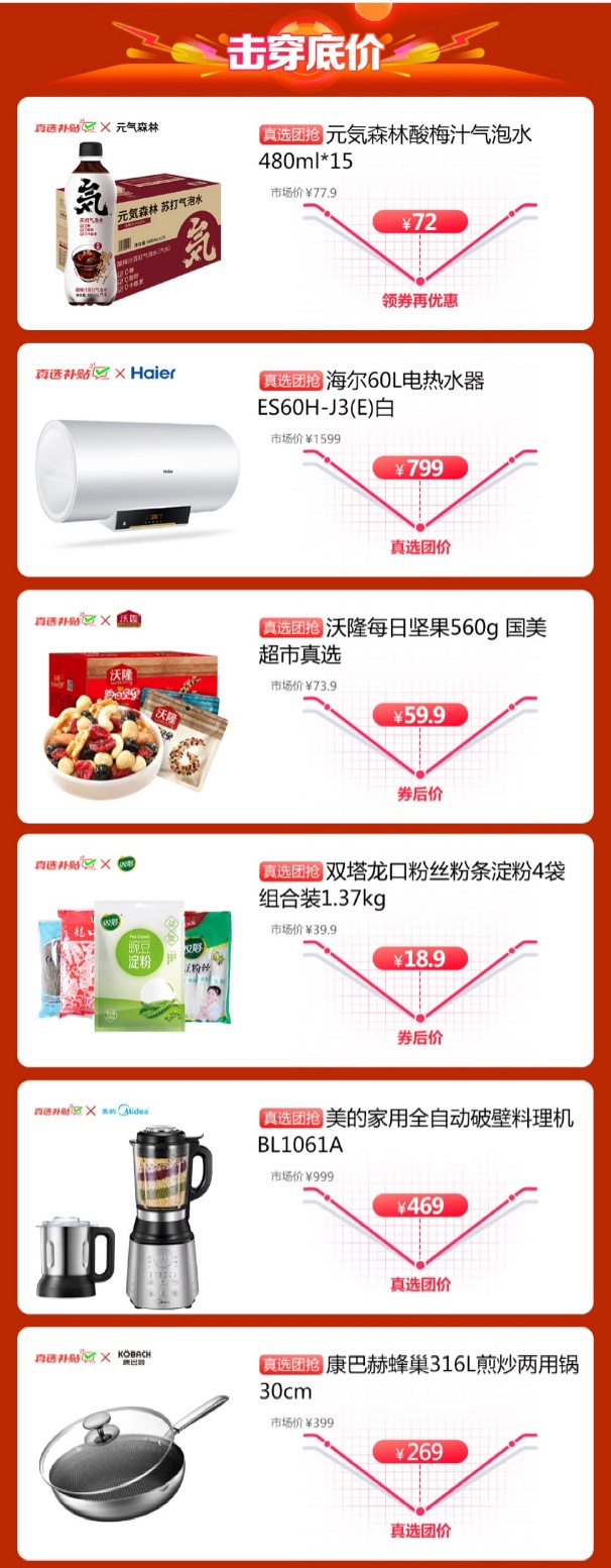 參與真選萬人團的產品,大家電如海爾電熱水器,市場價1599元,真選團購價低至799元;美的滾筒洗衣機,市場價3599元,真選團購價2499元……優(yōu)惠力度非常之大,部分產品優(yōu)惠可超千元。