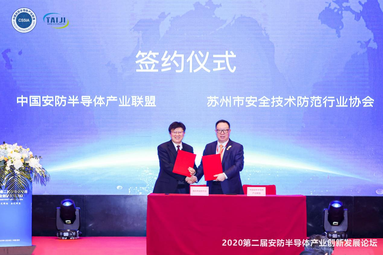 中國安防半導(dǎo)體產(chǎn)業(yè)聯(lián)盟主席楊金才和蘇州市安全技術(shù)防范行業(yè)協(xié)會秘書長王坤泉現(xiàn)場進(jìn)行簽約
