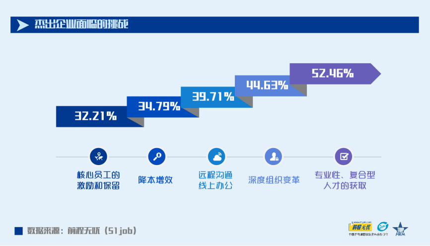 2020年杰出企業(yè)招聘員工總數(shù)較2019年增長了4.21%;55.48%的企業(yè)預(yù)計人均招聘成本呈增長趨勢,在此前提下,依然有56.04%的企業(yè)預(yù)計會在2021年擴(kuò)大招聘來獲取人才優(yōu)勢。894家獲獎企業(yè)中,有469家將“為籌備未來招募新團(tuán)隊,加大專業(yè)性人才和復(fù)合型人才的獲取“列為本年度企業(yè)人力資源管理所面臨的最大的挑戰(zhàn)。