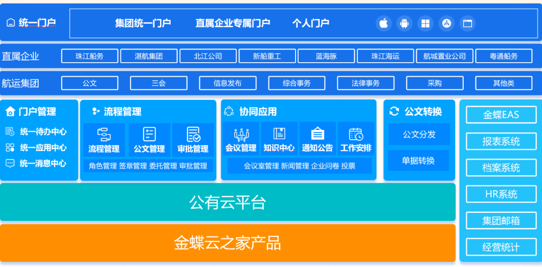 作為大型綜合性國(guó)企,廣東航運(yùn)集團(tuán)現(xiàn)有直屬企業(yè)8家,擁有全資、控股、參股及代理水路客運(yùn)港口13家,經(jīng)營(yíng)和管理96艘粵港澳高速客船。伴隨經(jīng)營(yíng)規(guī)模的發(fā)展、技術(shù)迭代、應(yīng)用場(chǎng)景深入,其信息化需要一個(gè)可以覆蓋集團(tuán)協(xié)同應(yīng)用場(chǎng)景的綜合辦公平臺(tái),而集團(tuán)原有的OA已經(jīng)無法滿足航運(yùn)的持續(xù)發(fā)展需要。