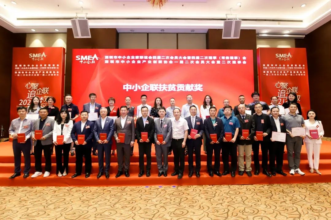 深圳市中小企業(yè)服務(wù)局副局長(zhǎng)陳小林(左九)為獲得扶貧貢獻(xiàn)獎(jiǎng)的企業(yè)家頒獎(jiǎng)
