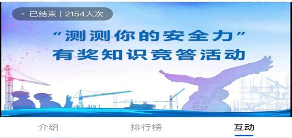 為切實提升公眾安全生產(chǎn)意識及知識水平,此次啟動儀式特別準備了“測測你的安全力”線上安全生產(chǎn)知識有獎問答活動,題目涵蓋高處作業(yè)、生產(chǎn)自救、用電安全等安全生產(chǎn)知識要點,寓教于樂。