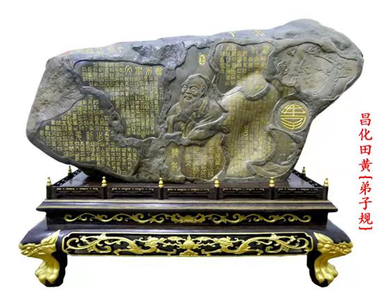 現(xiàn)場(chǎng)所見(jiàn),該展位展出的一排田黃石中,有兩塊雞血石雕件是錢(qián)高潮帶過(guò)來(lái)的。錢(qián)高潮是第二批國(guó)家級(jí)非物質(zhì)文化遺產(chǎn)項(xiàng)目石雕 (雞血石雕 )代表性傳承人、中國(guó)工藝美術(shù)大師、G20杭州峰會(huì)國(guó)禮設(shè)計(jì)制作者。另有一件作品是工藝美術(shù)師鄭先軍雕刻的昌化黑田《弟子規(guī)》,恩師錢(qián)高潮親手操刀題跋:“學(xué)無(wú)止境,寸草春暉”,激勵(lì)學(xué)生刻苦勤勉,牢記師傅“一生擇一事”,為了昌化石雕事業(yè),幾十年如一日的刻苦精神。