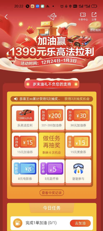 此外,“歲末油禮 ·油衷感謝”活動(dòng)期間,用戶在體驗(yàn)高德加油不下車服務(wù)便利的同時(shí),還可以參加樂高玩具、201 -200免減等新年禮物的抽獎(jiǎng),大獎(jiǎng)天天有。