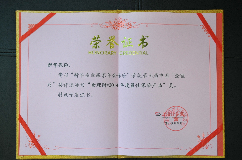 2015年5月28日,上海證券報主辦的第七屆“金理財”獎頒獎典禮在上海舉行。經(jīng)專家評審團的嚴格評審、結合網(wǎng)絡投票和微信投票情況,在進行綜合評議后,“新華盛世贏家年金保險”榮膺最佳保險產品獎。