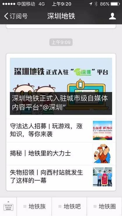 12月1日,深圳地鐵官方微信“深圳地鐵”正式入駐“@深圳”平臺。這是國內(nèi)首個(gè)城市級自媒體內(nèi)容平臺“@深圳”上線以來,又一入駐的官方微信。
