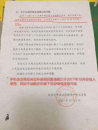 據(jù)悉,該市民在2017年已在信訪局上針對(duì)低層油煙管道對(duì)居民區(qū)排放油煙的問(wèn)題進(jìn)行投訴,當(dāng)年12月1日得到了深圳市羅湖區(qū)環(huán)境保護(hù)與水務(wù)局的回復(fù),稱(chēng)羅湖區(qū)環(huán)水局已于2017年1月對(duì)相關(guān)低空排放油煙的餐廳提出了要將油煙高空排放的要求,餐廳安裝的高空煙管也已于2017年10月正式投入使用。