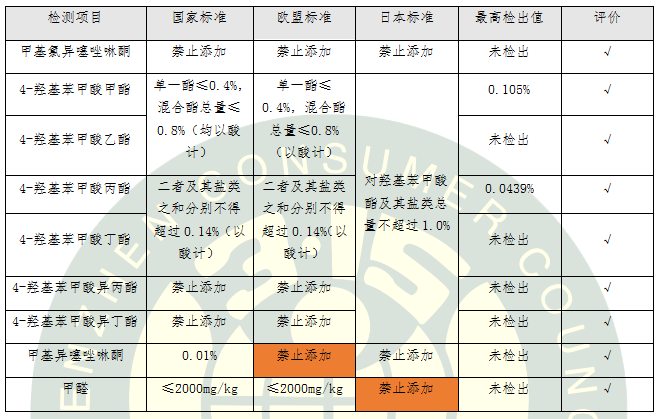 表3.不同國(guó)家地區(qū)防腐劑標(biāo)準(zhǔn)要求比對(duì)及評(píng)價(jià)結(jié)果
