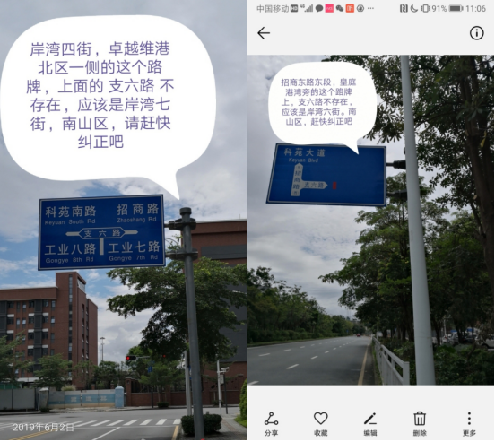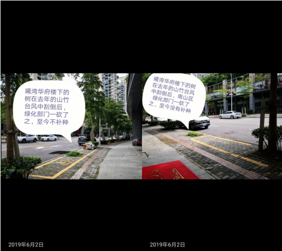 “南山區(qū)城管局當時回應道:‘因臺風砍倒的樹木將會統(tǒng)一采購,盡快予以補種;有問題的路牌將于七月底前更換。會盡快聯(lián)系南山稅務部門,修復有問題的井蓋’”,該市民卻對管理部門的工作效率提出質(zhì)疑:“然而現(xiàn)在距離投訴已經(jīng)兩個月了,問題依然存在。工作效率如此之低?”