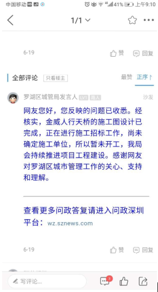 6月19日,羅湖區(qū)城管局表示“施工圖設計已完成,正在進行施工招標工作”。7月24日,該市民回帖詢問招標是否已有結果,表示“依然沒見工程隊施工”。