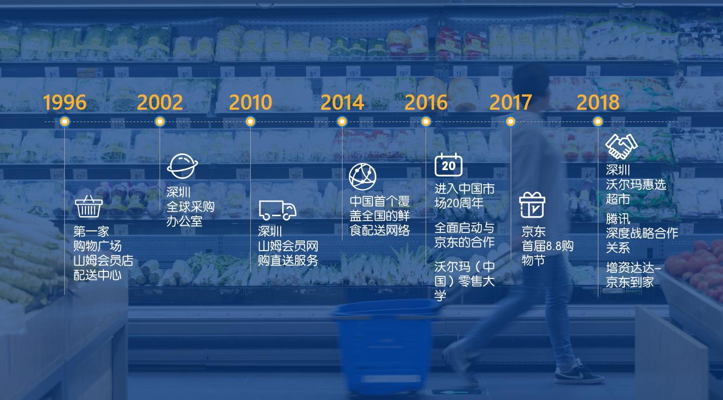 沃爾瑪于1996年在深圳開設中國第一家沃爾瑪購物廣場和山姆會員商店。進駐中國20余年,擁有員工約10萬。沃爾瑪目前已經(jīng)在全國180多個城市開設了400多家商場、9家干倉配送中心和11家鮮食配送中心。沃爾瑪中國與超過7,000家供應商建立了合作關(guān)系。