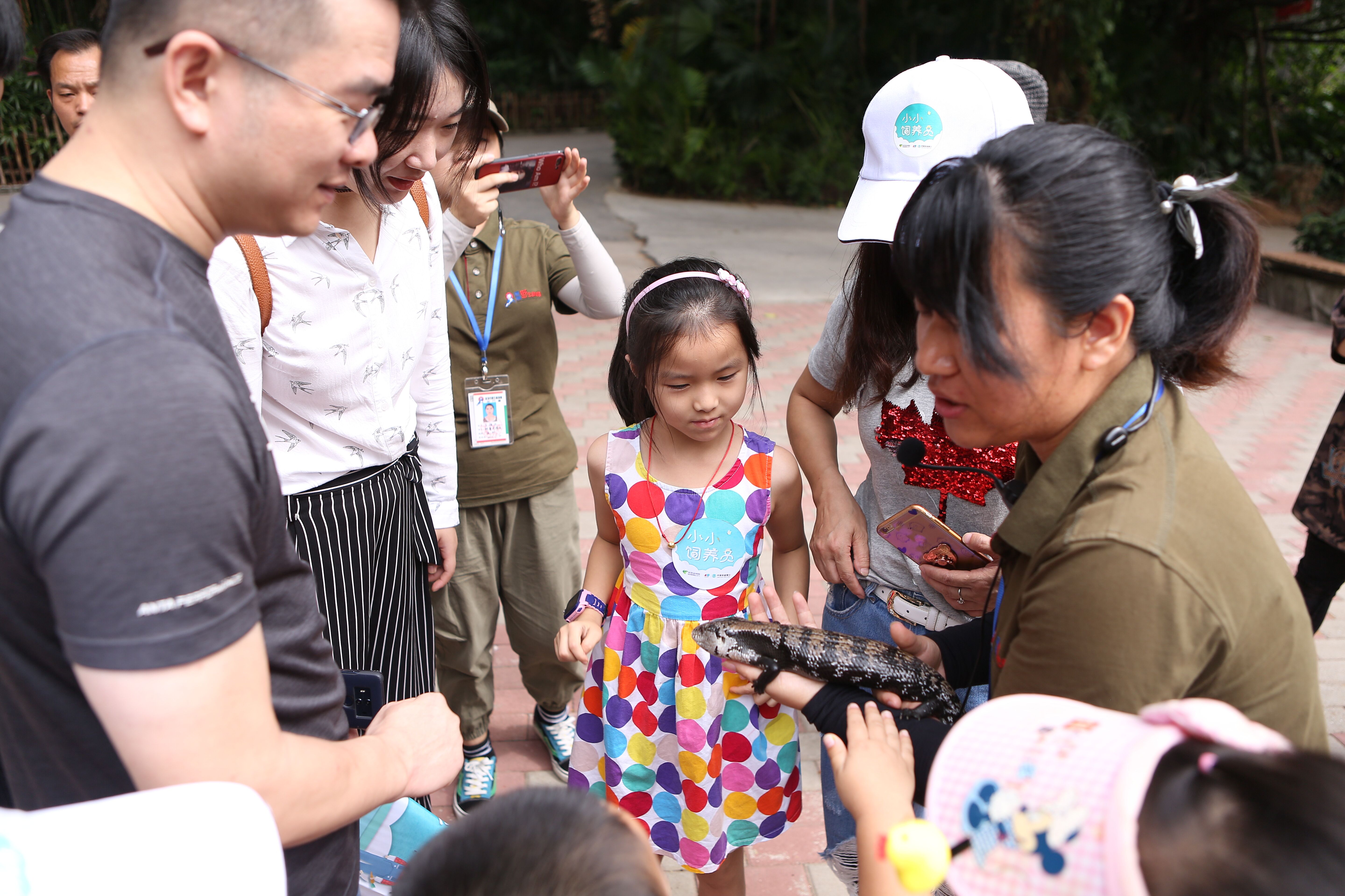 “鬃獅蜥和藍(lán)舌石龍子都是蜥蜴的一種。當(dāng)遭受威脅時(shí),鬃獅蜥會(huì)張開嘴及將帶刺的咽喉膨起來像一頭生氣的獅子。藍(lán)舌石龍子的舌頭是藍(lán)色的,平時(shí)會(huì)不時(shí)向外一伸一伸?!毙∨笥褌冋J(rèn)真地聽科普導(dǎo)游講解兩種蜥蜴的區(qū)別,膽大的孩子則抱起蜥蜴仔細(xì)觀察起來。