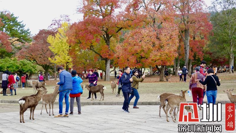 游覽神鹿公園喂飼馴鹿,是奈良觀光的象征性選擇。這里一年四季都游人如織,秋日紅葉映襯下的景觀更是情趣盎然。李仁奇攝