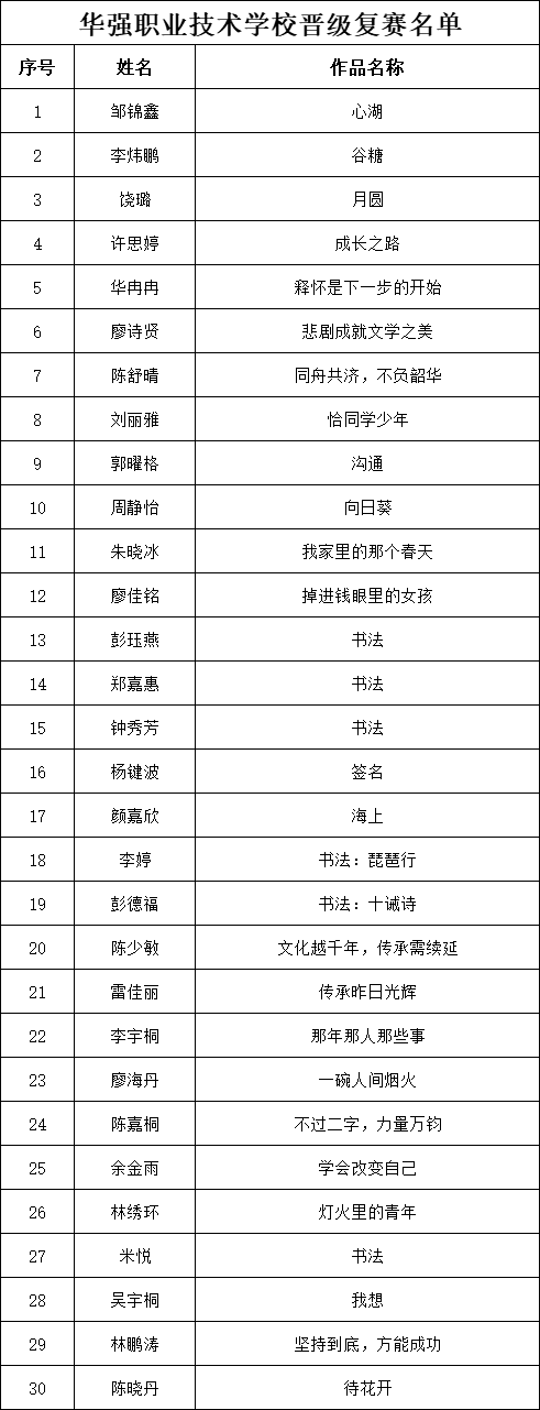 自2021年1月,活動(dòng)征稿啟動(dòng)以來(lái),獲得了深圳市廣大中小學(xué)生、教師、文學(xué)愛(ài)好者的熱烈響應(yīng)積極參與,吸引了深圳百余所學(xué)校的上萬(wàn)人關(guān)注報(bào)名?,F(xiàn)公布福田區(qū)華強(qiáng)職業(yè)技術(shù)學(xué)校專(zhuān)場(chǎng)晉級(jí)復(fù)賽名單如下: